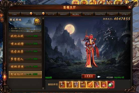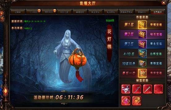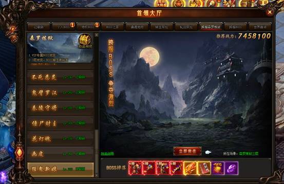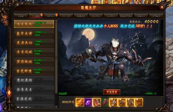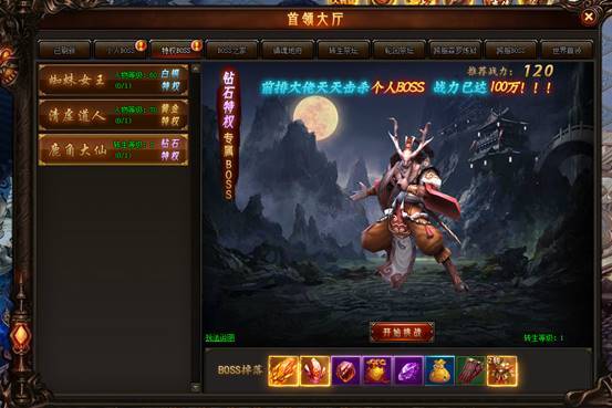 个人BOSS:个人BOSS是普通玩家获得道具材料的主要方式,每只个人BOSS都有一定的刷新时间,玩家每日可以多次挑战同一只BOSS,只要BOSS是已刷新状态的,随着玩家人物等级和转生等级的提高可以挑战更多的BOSS获得更高的奖励