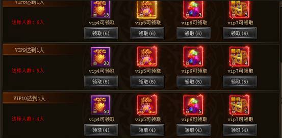 活动期间,对合服玩家已经达到相应VIP等级的玩家进行统计,发放全民福利!!!!VIP玩家越多,平民玩家的奖励就越多!!!