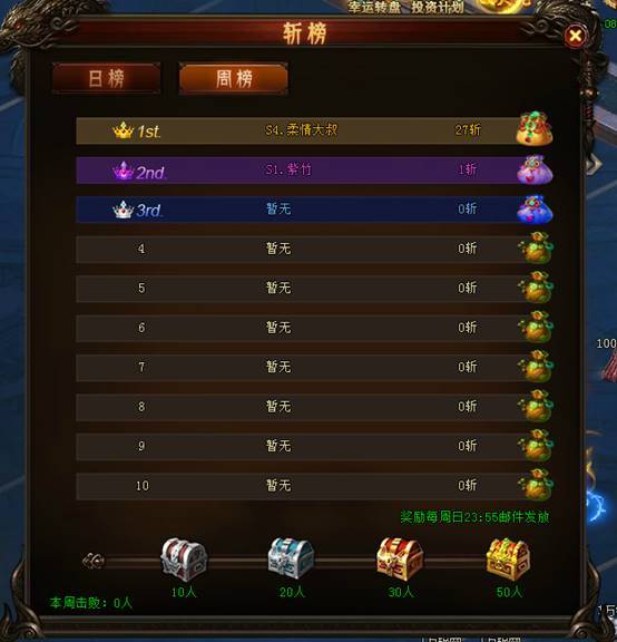6、周榜每周天23:55分结算,结算时对前十名发放大量道具奖励