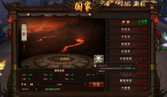 国家封号是关联与国家等级的极品属性养成功能、玩家通过日常活动、国家活动、国家任务、挂机刷怪等内容获得战功、进行该系统属性养成。通过提升封号等级、玩家可以在场景中激活相应的封号称号、并获得外显。
