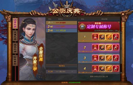 《阴阳道》公测期间,玩家充值一定的金砖就可以进入全服排名,达到一定的排名即可以各种极品道具奖励!!!!(第一名还将获得全服专属定制称号哦!!!!你想要什么称号就给做什么称号!!!!活动结束后联系客服小姐姐定制~)