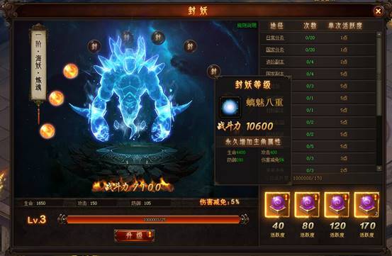 阴阳道封妖功能是一种长期的养成功能、玩家通过完成日常任务和活动来获取活跃度、消耗活跃度来养成封妖功能的等级、封妖的等级提升同时还可以为玩家带来大量属性、而且此处是玩家免费获得伤害减免属性的唯一途径哦!