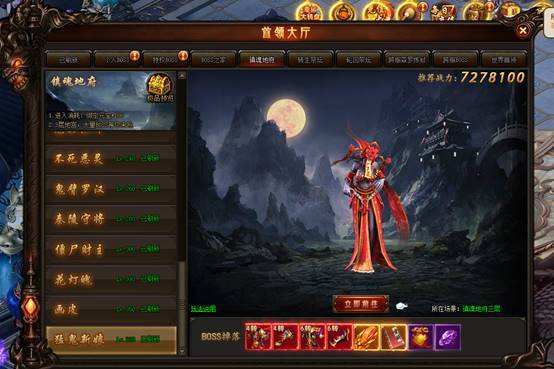 镇魂地府的BOSS是存在着一定的难度的,且随着层数的加深,玩家可以在此处遭遇其他国家的玩家,争夺性更强、危险也就越大,当然奖励也就越高。每次进入扣除100元宝
