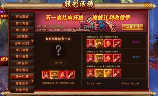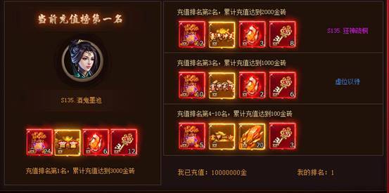 活动期间玩家充值达到一定档次即可进入排行榜排名,结算时根据排行榜排名投放稀有材料,更有稀有称号外显奖励