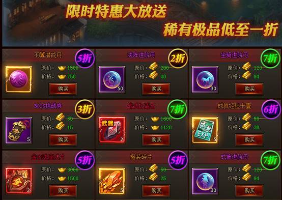 活动期间限时商城重启,低折扣概率将更高出现,消耗少量元宝、金砖,就能购买到平时限量获得的极品材料